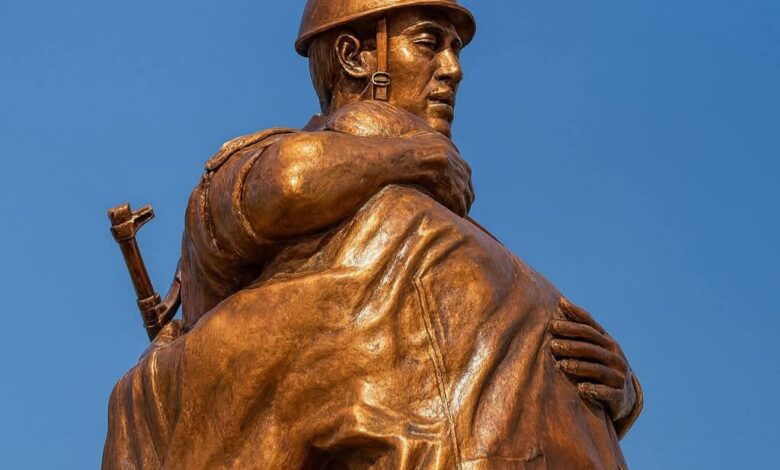 وظهر تمثال يجسد لحظة احتضان رجل يرتدي البزة العسكرية لإمراة نازحة في محاكاة لزيارة قائد الجيش معسكر العفاض لنازحي الفاشر.